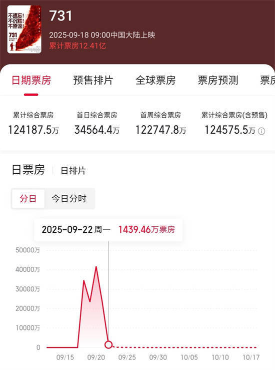 1905电影网讯 据票务平台数据显示,截至目前,电影《731》累计票房达到12.41亿元,超越《封神第二部:战火西岐》,进入2025年度票房榜前五。影片累计观影人数达3397.1万人次港联证券,自9月18日公映以来,连续四日单日票房突破2亿。